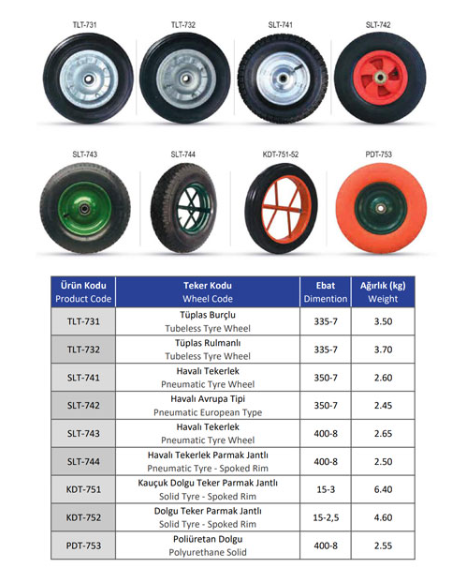 Teker Seçenekleri: TLT-731 Tüplas Burçlu Teker 335x7, TLT-732 Tüplas Rulmanlı Teker 335x7, SLT-741 Havalı Teker 350x7